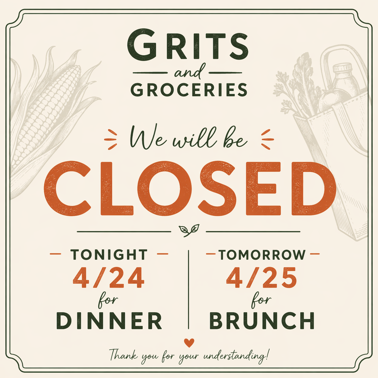 Everything you taste at Grits and Groceries is made with love and local ingredients. Always market-inspired, we source our ingredients within a 100-mile radius, if the right product is not available, we change the menu.
